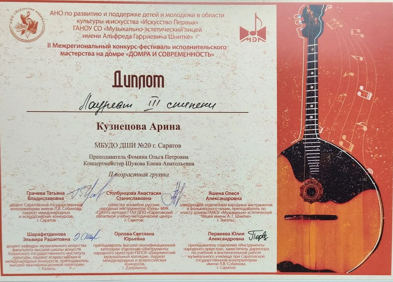 2 апреля 2026г на базе "Музыкально эстетического лицея имени А. Г. Шнитке" ,прошёл 29 марта, в Большом зале Саратовской государственной консерватории им. Л.В. Собинова, состоялся Городской конкурс детских хоровых коллективов имени Марии Васильевны Тельтевской. Благодарим юных артистов — за старание, волю к победе и высокий уровень исполнения. Выражаем искреннюю признательность педагогам и концертмейстерам за профессионализм, а родителям — за поддержку и терпение. Убеждены, что для наших ребят участие в таком престижном конкурсе, на прославленной сцене консерватории — это бесценный опыт и важный шаг на пути творческого развития. Желаем нашему хору дальнейшего роста, вдохновения и новых ярких успехов! 28 марта 3026 г. в г. Пензе завершилось прослушивание участников XIV Всероссийского фестиваля - конкурса классической и современной музыки для детей и юношества, посвящённый творчеству В. А. Моцарта "Музыкальный подснежник", который состоялся при поддержке Министерства культуры и туризма Пензенской области, Международного союза музыкальных деятелей, Регионального центра развития образования в сфере культуры и искусства в Пензенский области, РОО Союза музыкальных деятелей Пензенской области, ГАУК ПО «Пензаконцерт», Регионального центра развития образования в сфере культуры и искусства Пензенской области, Пензенского музыкального колледжа им. А. А. Архангельского. Поздравляем победителей третьего городского конкурса юных исполнителей на баяне, аккордеоне и гармони имени Бориса Ивановича Скворцова, прошедшего 26 марта, в концертном зале школы, по адресу Навашина 38, прошёл профориентационный концерт студентов IV курса Саратовского областного колледжа искусств, отделения «Хоровое дирижирование». Поздравляем участников и победителей городского конкурса имени В.А.Каширина, прошедшего 23,24 марта 2026 года в МБУДО«ДМШ № 3»: Фойгель Валерию- лауреат 2 степени, Айрапетян Лину- лауреат 2 степени, Дюжикову Дарью- лауреат 2 степени, фортепианный ансамбль Егину Софью и Кучукбаеву Лилию- дипломант 1 степени, Панкову Софью- участие. Желаем дальнейших творческих успехов и побед! Поздравляем учащихся школы принявших участие в Международном конкурсе хореографического и вокального мастерства "Сфера роста" г. Москва, Баканову Анастасию - Лауреат 1 степени, Точилову Софью - Лауреат 2 степени, Карасеву Викторию - Лауреат 3 степени В Санкт-Петербурге продолжает свою работу IX Международный конкурс вокалистов имени Б.Т. Штоколова. Мероприятие организовано Российским государственным университетом им. А. И. Герцена, собрало около 400 участников из 57 городов и 9 стран. Церемония открытия проходило в Малом зале имени М. И. Глинки Санкт-Петербургской академической филармонии им. Д. Д. Шостаковича. Организатором события выступает институт музыки, театра и хореографии РГПУ им. А. И. Герцена. Карасева Виктория, Точилова Софья и Баканова Анастасия (класс Никитиной Э. В. концертмейстер Шукова Е. А.) 14 марта в Областной библиотеке им. А. С. Пушкина состоялась Ребята представили свои работы, в которых раскрывается книжная экспозиция, посвященная зиме в русской поэзии. На ней ребята познакомились с книжными изданиями, представили стихи А. С. Пушкина, Ф. И. Тютчева, А. А. Фета, С. А. Есенина и других поэтов. Также на выставке были рассказы и сказки о зиме. Юные художники класса Конс