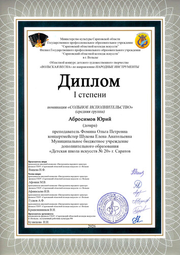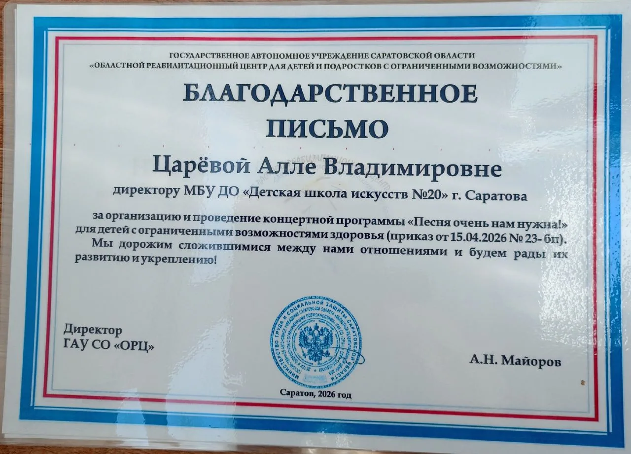 17 апреля 2026 г. в ГАУК в реабилитационном центре для детей с ограниченными возможностями здоровья прошёл концерт учащихся академического вокала МБУДО "ДШИ № 20". Программа называлась "Песня очень нам нужна! Демонстрировали сценическую выдержку и эмоциональную актёрскую свободу учащиеся Карасёва Виктория, Точилова Софья, Баканова Анастасия. Звучали весёлые, задорные и юмористические песни. На концерте живым примером в качестве образца вокального мастерства для подопечных, выступала наставник и педагог Никитина Э.В.